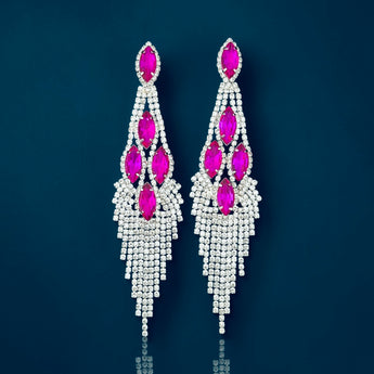 The Enchanted Earrings in fuchsia and clear rhinestones bring bold feminine power with a silver finish that lets every hue shine. Designed for the stage and made for the spotlight, they’re the statement your glam wardrobe was missing.