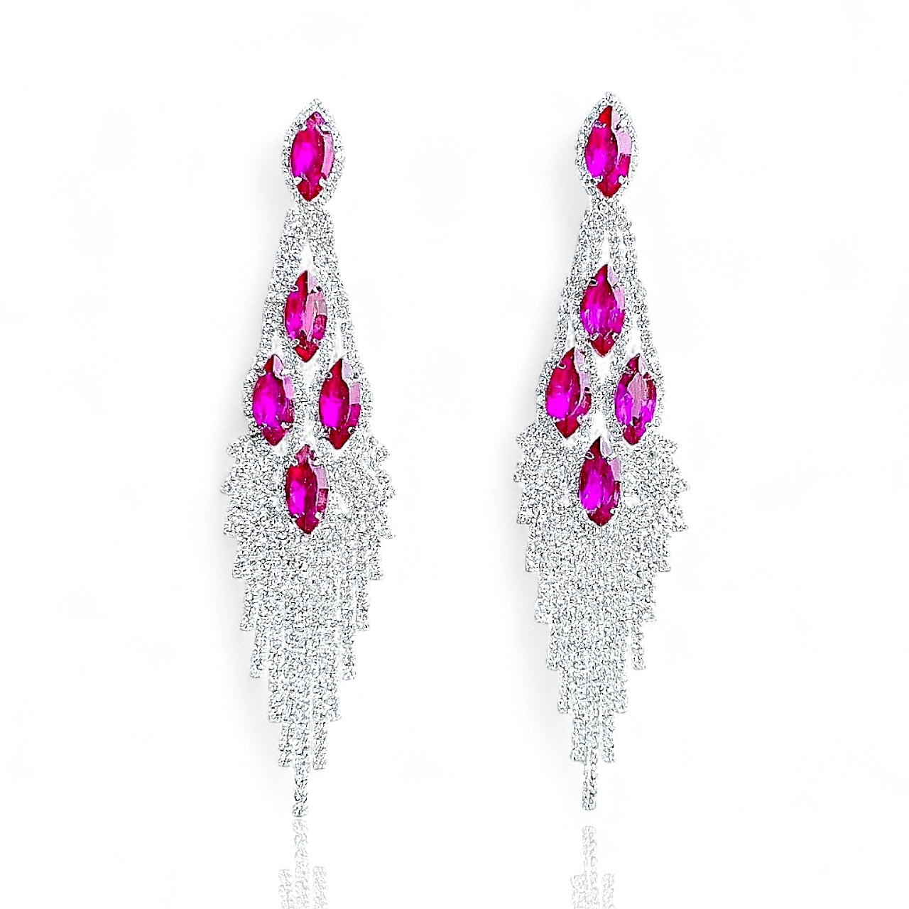 The Enchanted Earrings in fuchsia and clear rhinestones bring bold feminine power with a silver finish that lets every hue shine. Designed for the stage and made for the spotlight, they’re the statement your glam wardrobe was missing.