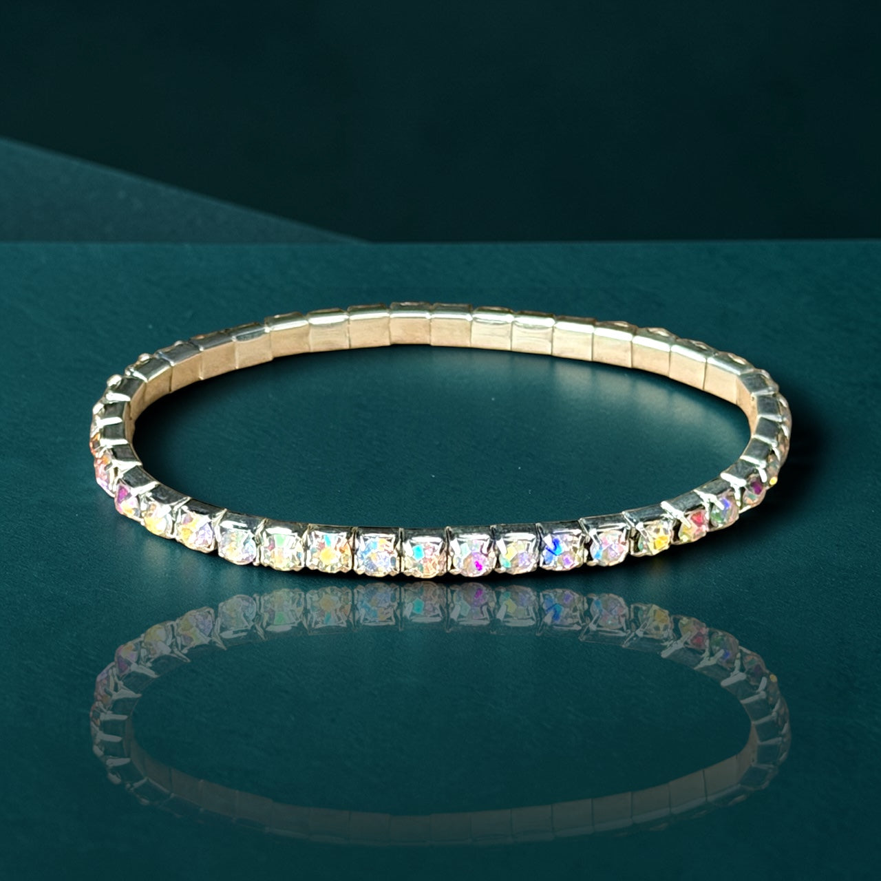 This single-row AB rhinestone stretch bracelet is made for Goddesses who love a delicate look with a dreamy, color-shifting finish. Sleek, feminine, and easy to wear, it adds just the right touch of iridescent glam to your stage look.