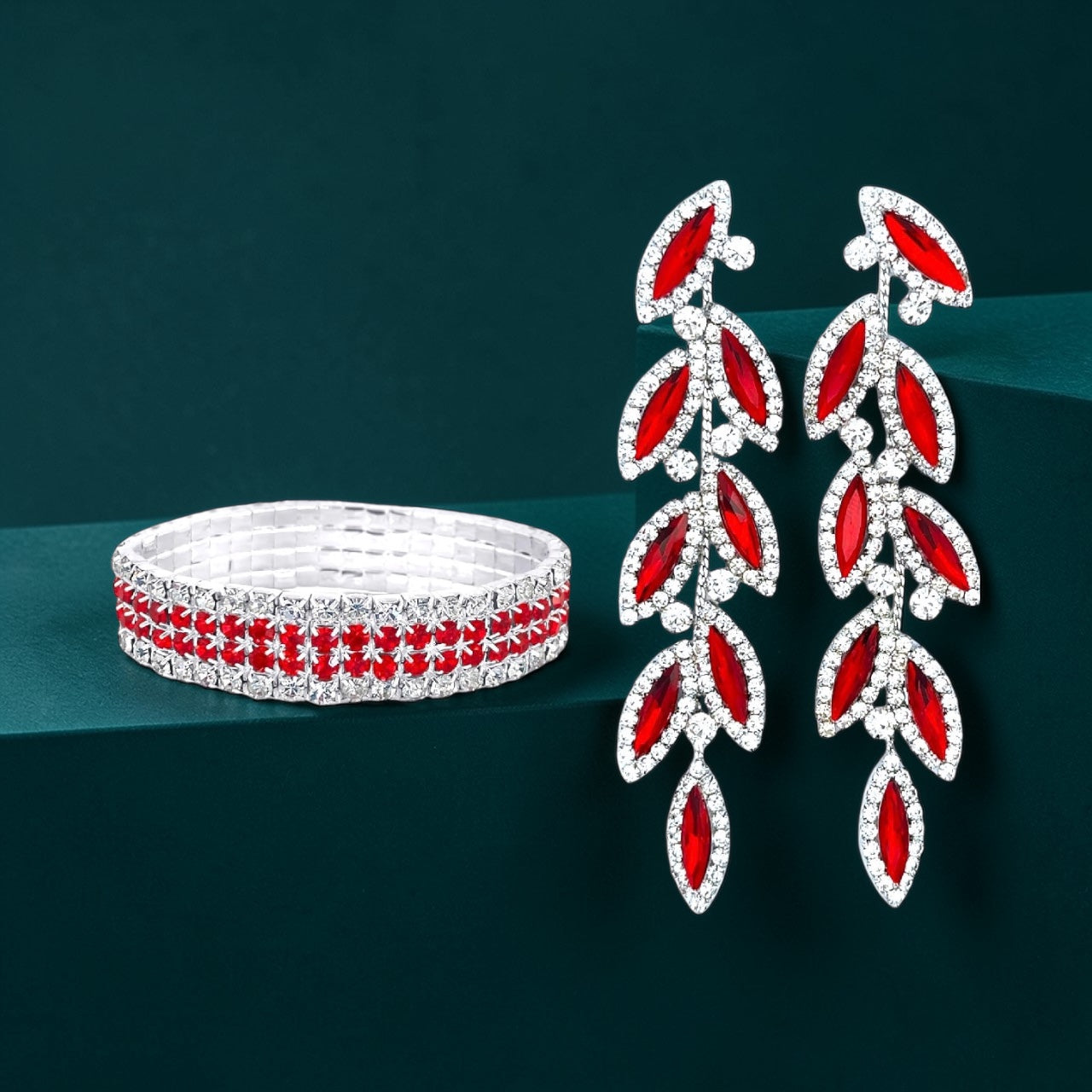 Turn up the heat, Goddess. The Charlo Set blends radiant clear with fiery ruby rhinestones for a look that’s equal parts elegance and power. With bold marquise leaf drops and a matching stretch bracelet, this set was made to catch the light—and keep every eye on you.