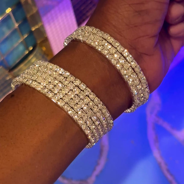 The Snake Charmer crystal Rhinestone adjustable wraparound competition jewelry bracelet shown here in clear rhinestones on a silver metal finish. The Snake Charmer bracelet is great for all wrist sizes as this specific style is sturdy and flexible but is adjustable to ensure a snug fit on all wrist sizes. This is the perfect bracelet for the Goddess that prefers a more relaxed fit bangle style bracelet and is looking to exude her divine femininity on the NPC or IFBB competition stage.