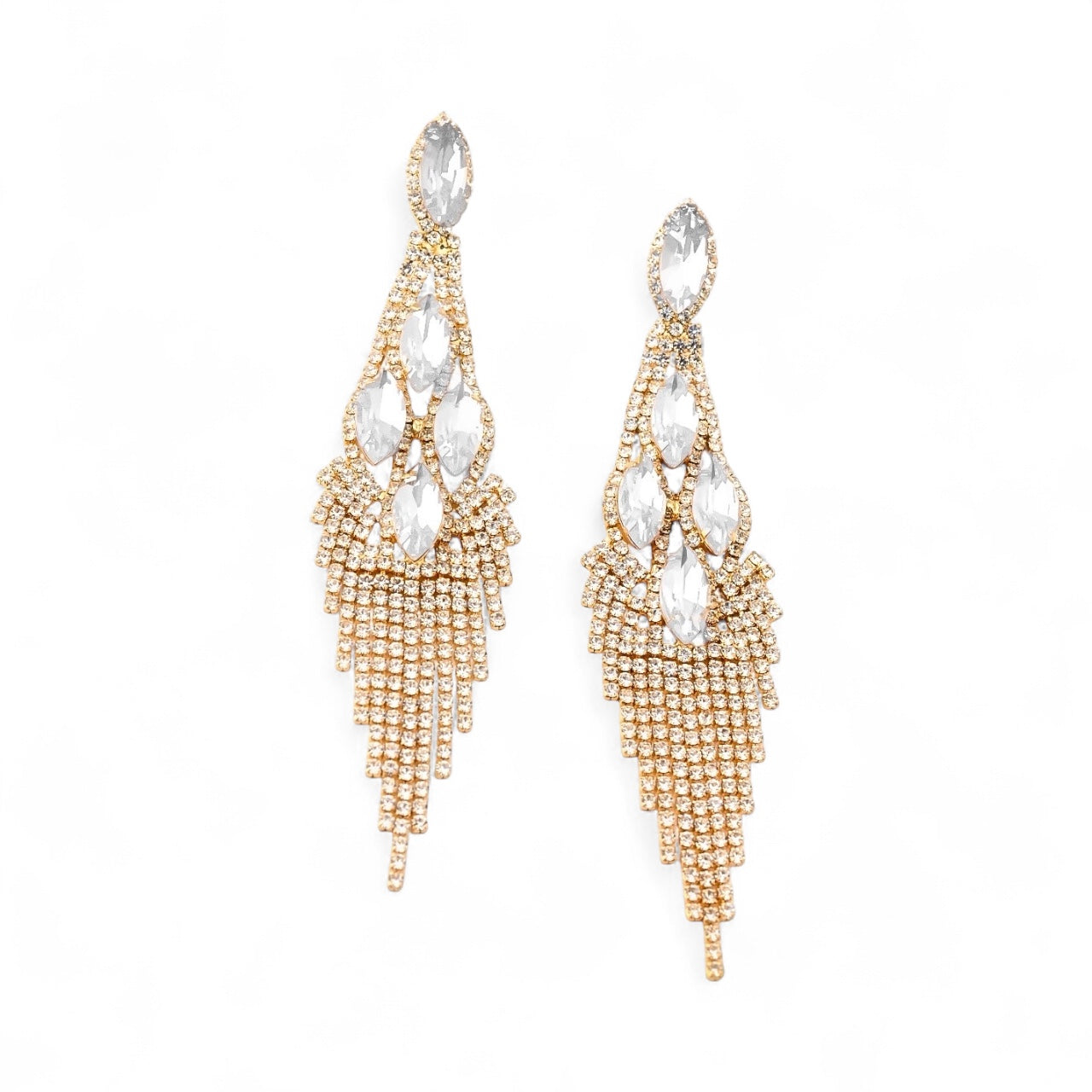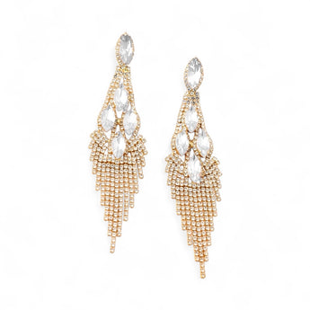 The Enchanted Earrings bring elegance to life with cascading clear marquise rhinestones set on rich warm gold-tone metal. Their elongated silhouette and sparkle-drenched design frame your face beautifully—made to captivate judges, cameras, and every pair of eyes in the room.