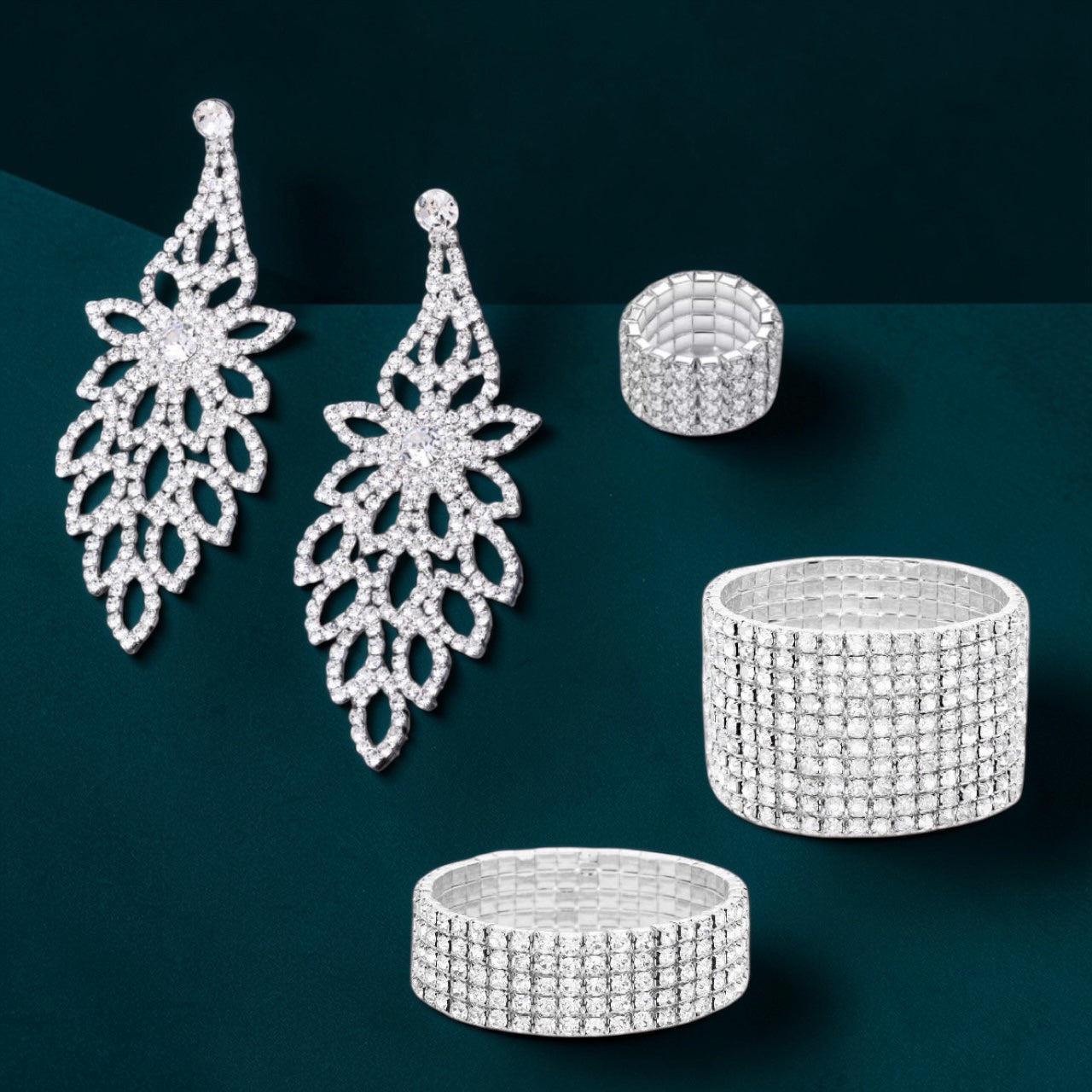 • ✨ Clear rhinestones on silver — crisp, icy sparkle that reads luxe from every angle